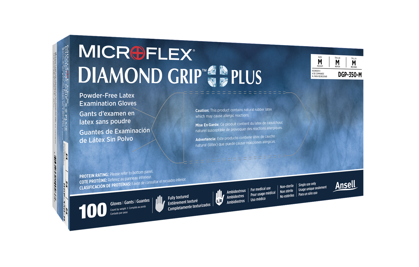 MicroFlex® Diamond Grip Plus™ Latex Exam Gloves offer superior durability and reliable protection for medical and laboratory professionals. Made from premium-quality latex, these powder-free gloves provide enhanced grip, tactile sensitivity, and a comfortable fit. Their textured fingertips ensure secure handling in both wet and dry conditions. Ideal for high-risk or heavy-duty applications, these gloves meet stringent quality standards for barrier protection and performance.